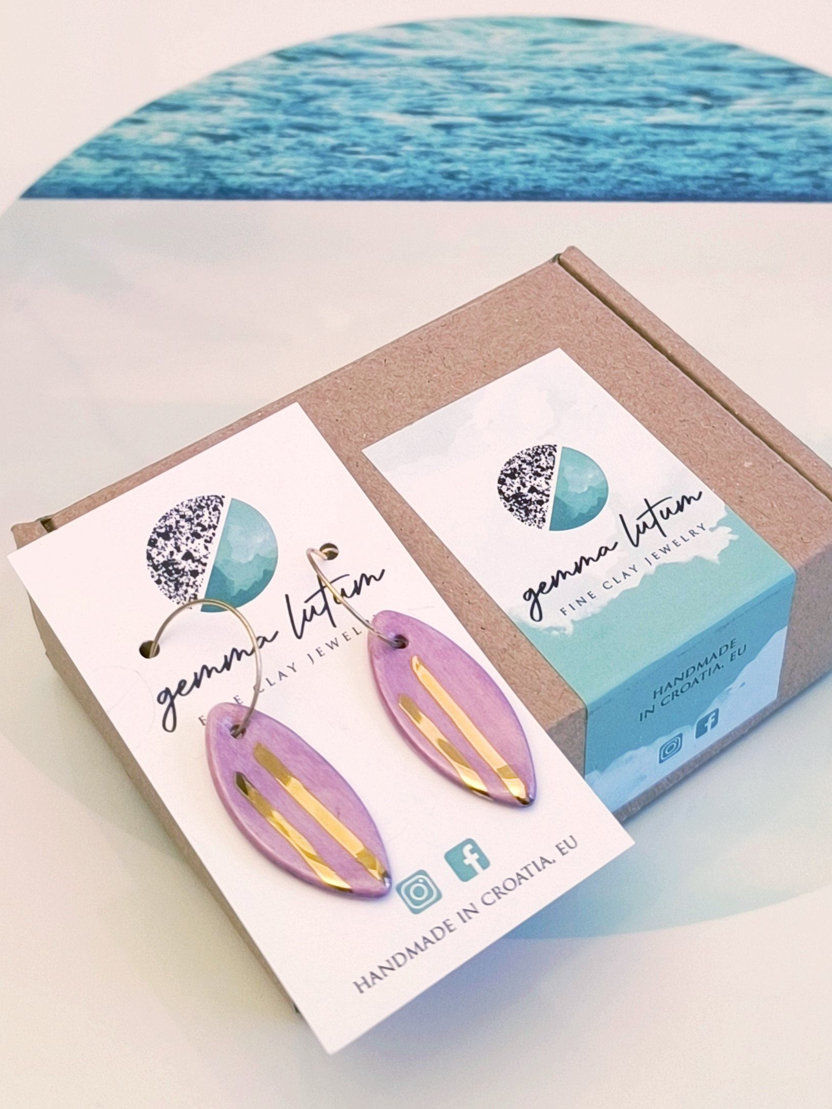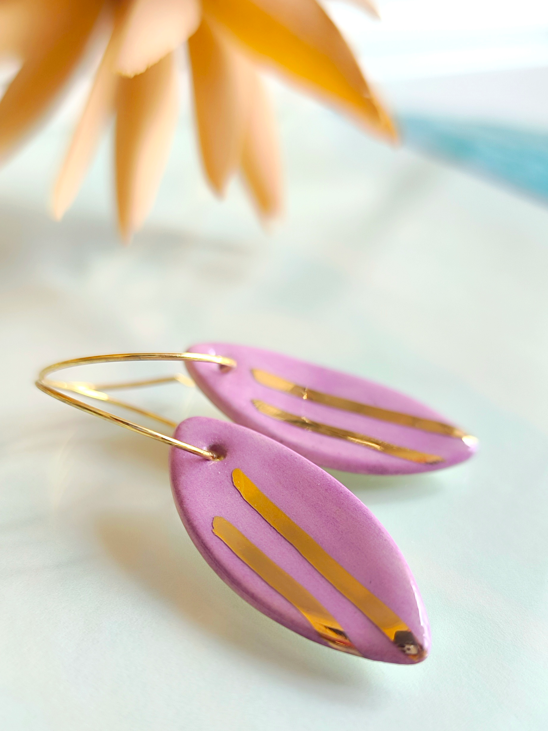 MARQUISE SHAPED ceramic dangle earrings, PURPLE & GOLD
