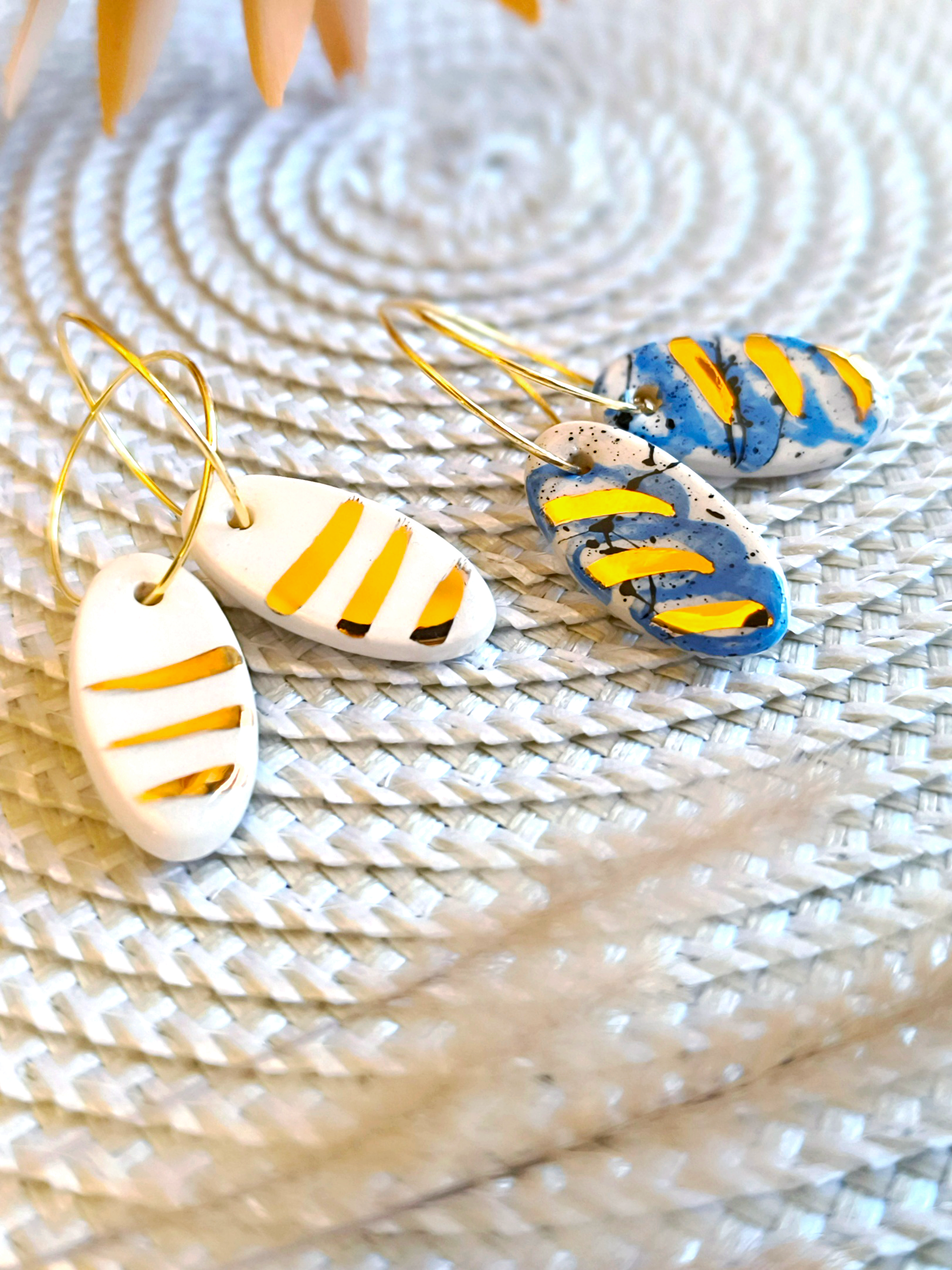 OVAL SHAPED ceramic dangle earrings, BLUE & GOLD
